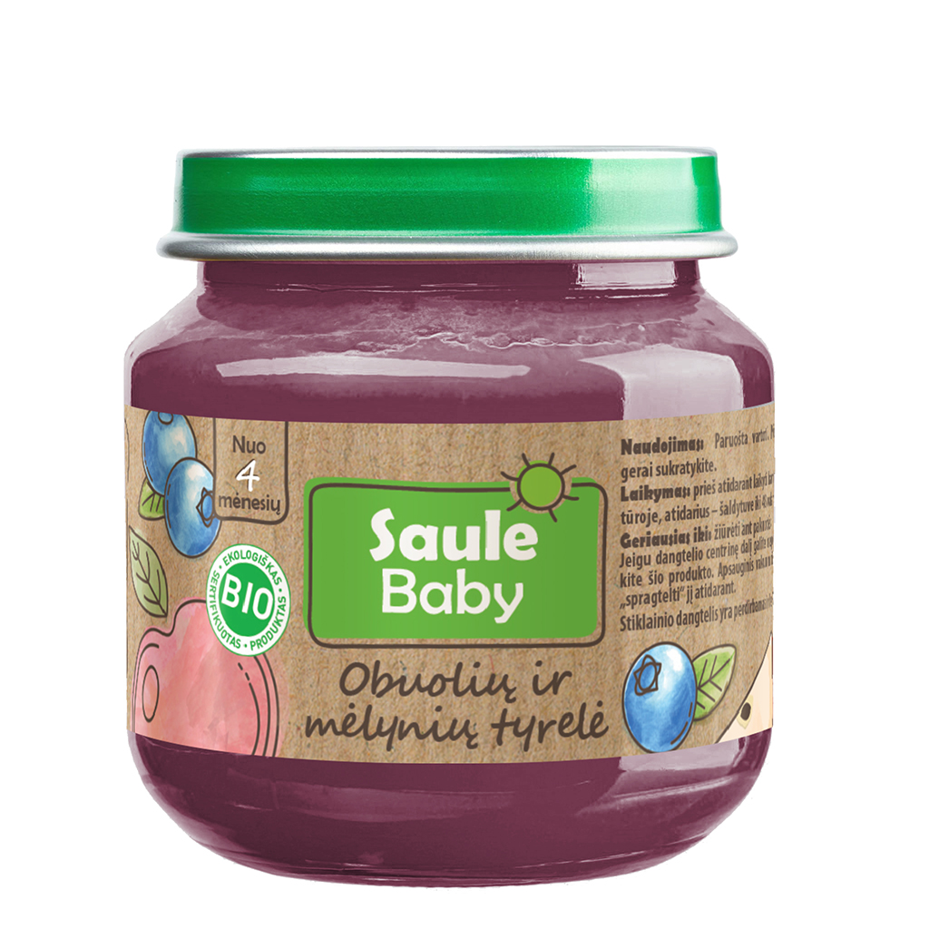 Organic baby food – apple and blueberry puree, 125 g per jar. From 4 months. Gluten-free, no added preservatives or sugars.