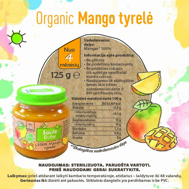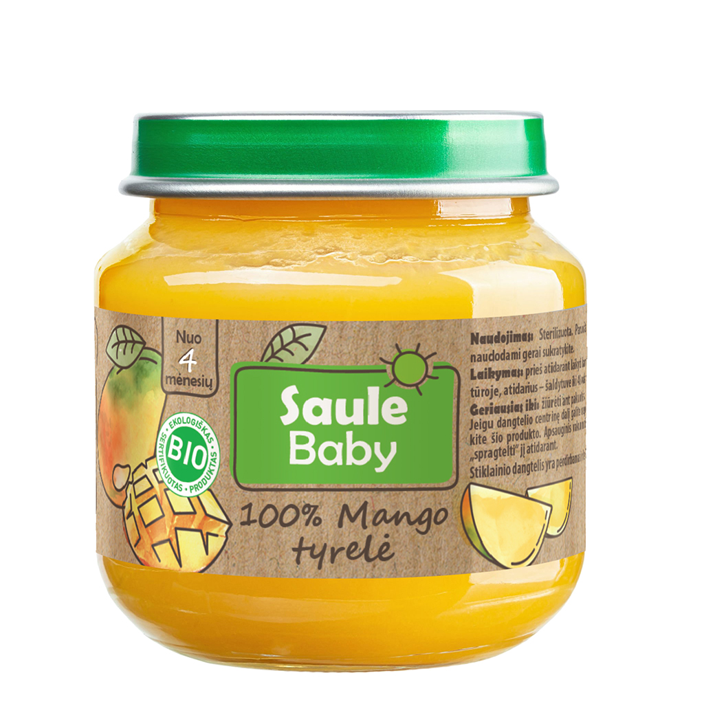 Organic baby food – mango puree, 125 g per jar. From 4 months. Gluten-free, no added preservatives or sugars.